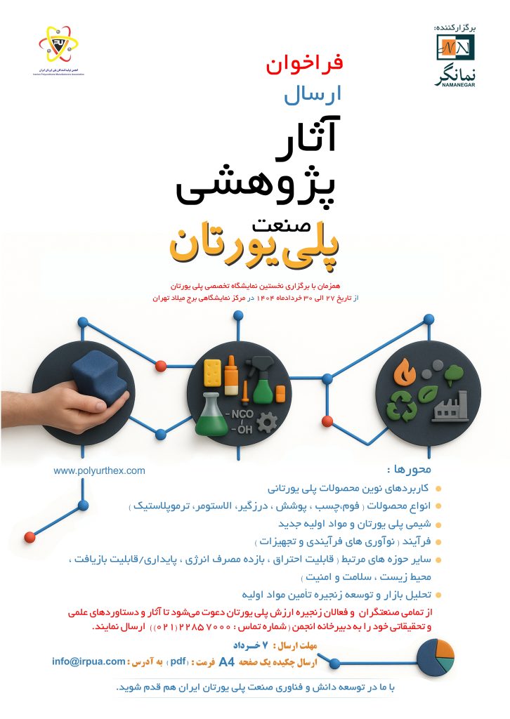 به مناسبت برگزاری نخستین نمایشگاه بینالمللی پلییورتان ایران، از تاریخ ۲۷ تا ۳۰ خردادماه ۱۴۰۴ در مرکز نمایشگاهی برج میلاد تهران، از تمامی صنعتگران و فعالان زنجیره ارزش پلییورتان دعوت میشود تا آثار و دستاوردهای علمی و تحقیقاتی خود را به دبیرخانه انجمن ارسال نمایند. این فراخوان با هدف ارائه آخرین پژوهشها و نوآوریها در حوزه پلییورتان، ایجاد بستر تبادل دانش فنی برگزار میگردد.